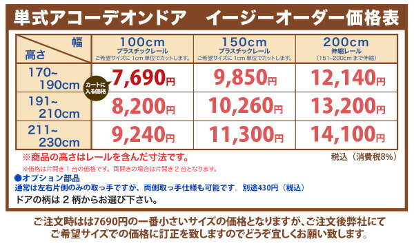 商品名アコーディオンドア 木目調 イージーオーダー (単式アコーディオンドア)製品サイズイージーオーダーレール幅は、製品幅100cmと150cmはプラスチックレールが付属になり、1cm単位でカット致しますのでご注文の際備考欄までサイズをご記入ください。